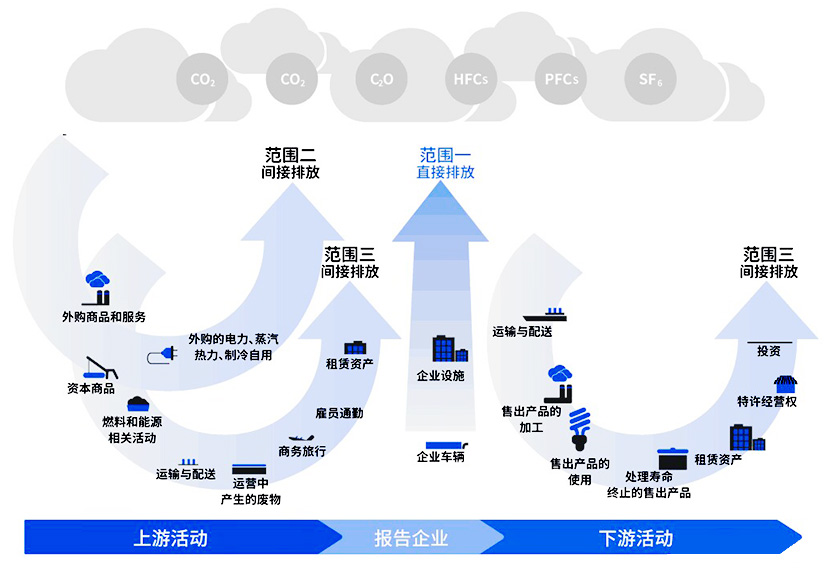 范围3:其他间接排放,如供应链、员工通勤等。