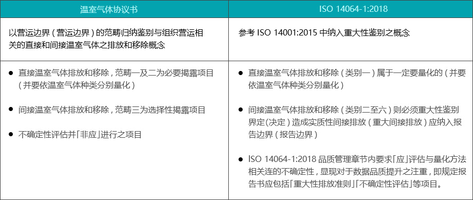 以适用对象来看,GHG Protocol标准主要是从"企业"开发温室气体盘查清册的角度来编写的,而ISO14064-1:2018文件则详细说明「组织层级(organization-level)」设计、开发、管理、报告温室气体盘查清册的原则与要求。